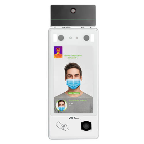 Preventative Measures Mask detection / Body temperature detection Temperature Measurement Distance 50cm to 120cm (1.64ft to 3.94ft) Temperature Measurement Accuracy ±0.3°C (±0.56°F) Temperature Measurement Range 20°C to 50°C (68°F to 122°F) User Capacity 10,000 Face Capacity 10,000 Fingerprint Capacity 10,000 ID Card Capacity 10,000 Transaction Capacity 100,000 Communication TCP/IP / USB Host / Wiegand Input / Wiegand Output / Bluetooth / WIFI Access Control Interface Lock Relay Output / Exit Button / Alarm Output / Door Sensor / External Bell Hardware High-Performance Android Industrial CPU / 2GB DDR3 RAM / 16GB ROM / QR Code Module (Optional: Z-ID Fingerprint Sensor) / 7-inch Touch Screen, 1280 * 800 Pixels / 2MP Binocular Camera Standard Functions ID Card / Work Code / Push / DST / Schedule Bell / Automatic Status Switch / Record Query / Photo ID Special Functions Enhanced Visible Light Facial Recognition / Live Face Detection / Live Fingerprint Detection / Multiple Biometric Verification Modes Optional Functions 13.56MHz IC Card / ICASS Card / HID Card Compatibility ZKBioSecurity (Only Access Control Firmware) Algorithm ZKFace5.6 & ZKFinger 10.0 Working Temperature 0°C to 50°C (32°F to 122°F) Operating Temperature 10°C to 35°C (50°F to 95°F) Working Humidity <90% Dimension 246 * 120 * 51 mm (9.69 * 4.72 * 2 in) Facial Recognition Speed ≤1s Facial Recognition Distance 0.5m to 3m Power Supply DC12V 3A