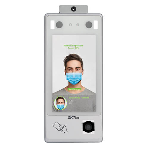 Preventative Measures Mask detection / Body temperature detection Temperature Measurement Distance 30 ~ 50cm (1 ~ 1.64ft) Temperature Measurement Accuracy ±0.3°C (±0.56°F) Temperature Measurement Range 34 ~ 45°C (93.2 ~ 113°F) User Capacity 10,000 Face Capacity 10,000 Fingerprint Capacity 10,000 ID Card Capacity 10,000 Transaction Capacity 100,000 Communication TCP/IP / USB Host / Wiegand Input / Wiegand Output / Bluetooth / WIFI Access Control Interface Lock Relay Output / Exit Button / Alarm Output / Door Sensor / External Bell Hardware High-Performance Android Industrial CPU / 2GB DDR3 RAM / 16GB ROM / QR Code Module (Optional: Z-ID Fingerprint Sensor) / 7-inch Touch Screen, 1280 * 800 Pixels / 2MP Binocular Camera Standard Functions ID Card / Work Code / Push / DST / Schedule Bell / Automatic Status Switch / Record Query / Photo ID Special Functions Enhanced Visible Light Facial Recognition / Live Face Detection / Live Fingerprint Detection / Multiple Biometric Verification Modes Optional Functions 13.56MHz IC Card / ICASS Card / HID Card Compatibility ZKBio Time (Only Time & Attendance Firmware) / ZKBioSecurity (Only Access Control Firmware) Algorithm ZKFace5.6 & ZKFinger 10.0 Working Temperature 0°C ~ 50°C (32°F ~ 122°F) Operating Temperature 16°C ~ 32°C (60.8°F ~ 89.6°F) Working Humidity < 90% Dimension 246 * 120 * 51 mm (9.69 * 4.72 * 2 in) Facial Recognition Speed ≤1s Facial Recognition Distance 0.5m ~ 3m Power Supply DC12V 3A