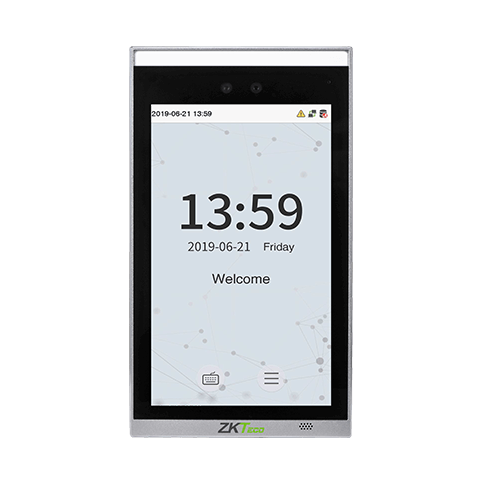 Linux-Based Hybrid-Biometric Access Control Terminal with Visible Light Facial Recognition & Palm Recognition Features · Visible light facial recognition, and palm recognition · Anti-spoofing algorithm against print attack (laser, color and B / W photos), video attack and 3D mask attack · Multiple verification methods: Face / Palm / Fingerprint / Card / Password · 125kHz ID card (EM) / 13.56MHz IC card and fingerprint (Optional) and palm · Huge capacity of 10,000 facial templates · Compatible with turnstiles of ZKTeco and the third parties · Supplement lighting with adjustable brightness · 7" LCD touchscreen